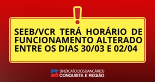 Por questões administrativas, entre os dias 30 de março e 2 de abril, o Sindicato dos Bancários de Vitória da Conquista e Região (SEEB/VCR) informa que o atendimento será encerrado excepcionalmente às 17h.