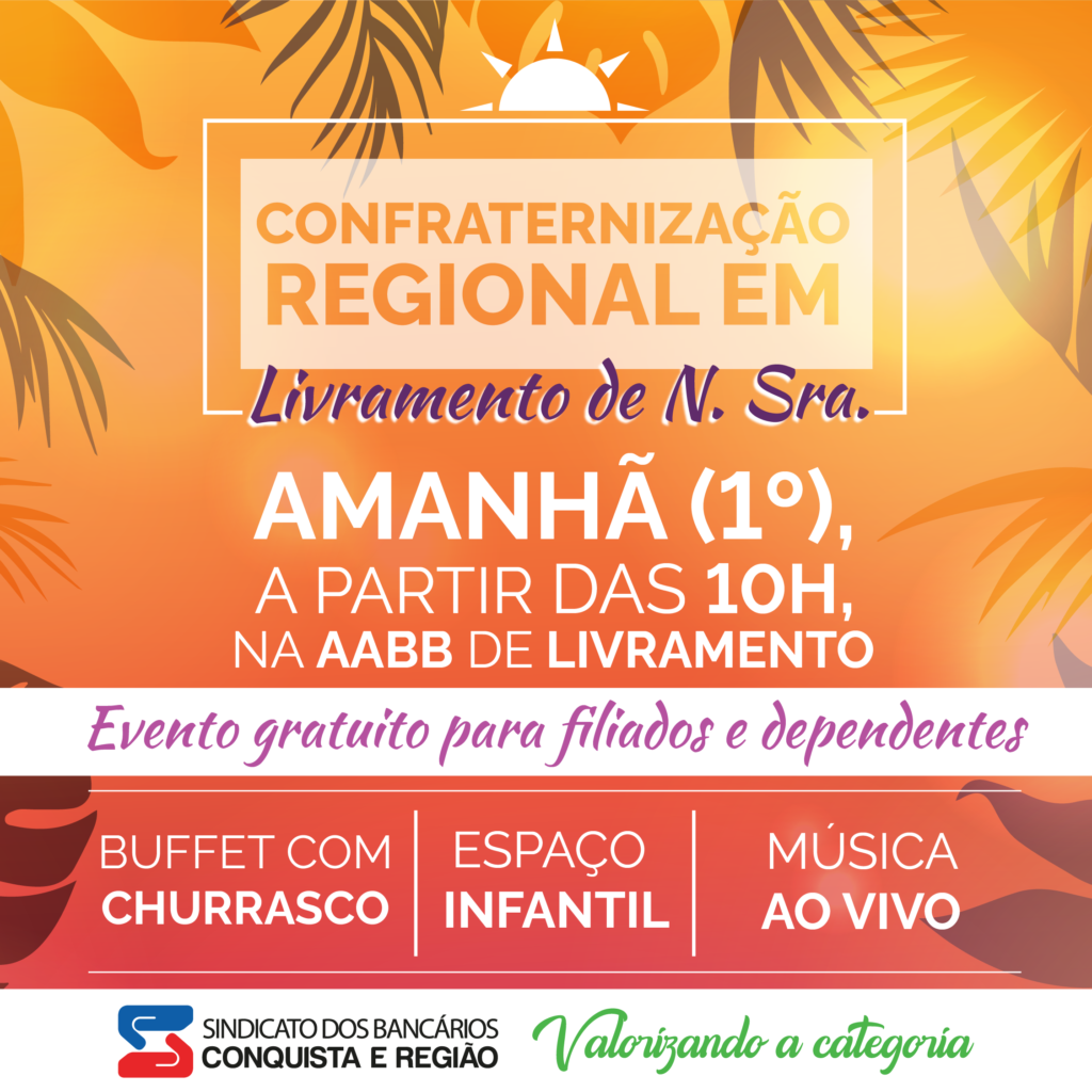 Neste sábado (1º), acontece a Confraternização Regional dos Bancários em Livramento, promovida pelo Sindicato dos Bancários de Vitória da Conquista e Região. A entrada gratuita para bancários, bancárias e seus dependentes.