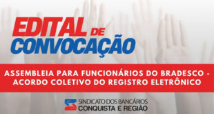 O Sindicato dos Bancários de Vitória da Conquista e Região convoca todas as bancárias e bancários do Bradesco, sindicalizados ou não, de sua base territorial, para votarem na Assembleia Extraordinária Específica.