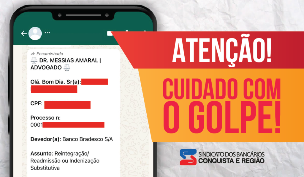 O Sindicato dos Bancários de Vitória da Conquista e Região recebeu denúncias de que um número suspeito está entrando em contato com bancários e bancárias via WhatsApp, afirmando ser o advogado Messias Amaral. NÃO CONFIE: É GOLPE!