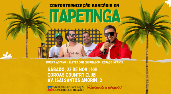 Bancárias e bancários da Itapetinga e Região, se preparem! A tão esperada Confraternização Regional vai ser realizada no dia 22 de novembro, a partir das 10h, no Coroas Country Club (Av. Isai Santos Amorim, 2). O evento contará com um delicioso buffet de churrasco e bebidas geladas para todos os gostos — cerveja (Heineken e Original), coquetel, refrigerantes e água. Para que mães e pais possam aproveitar o dia com tranquilidade, o espaço também terá uma área infantil completa, com brinquedos, pipoca, algodão doce e muita diversão para a criançada. E não para por ai! A animação da festa está …