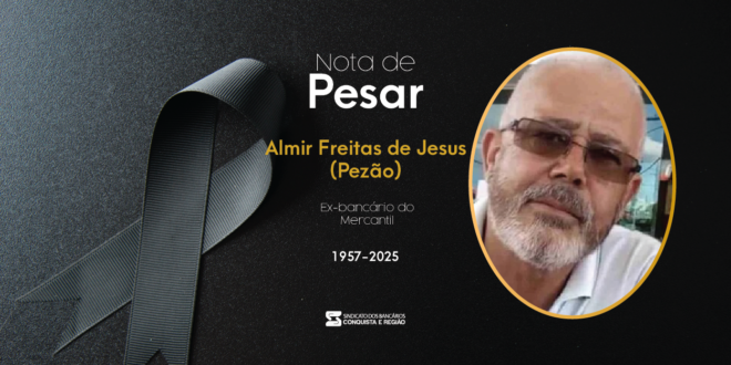 É com profundo pesar que o Sindicato dos Bancários de Vitória da Conquista e Região (SEEB/VCR) comunica o falecimento do ex-bancário do Mercantil, Almir Freitas de Jesus, aos 66 anos, vítima de complicações de saúde. Ele atuou como funcionário do Banco Mercantil em Conquista, admitido em 1981, e foi filiado ao SEEB/VCR. O sepultamento ocorreu na terça (6), no Cemitério da Saudade. O SEEB/VCR expressa suas mais sinceras condolências aos familiares e amigos enlutados.