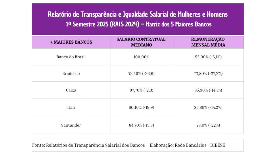 Segundo levantamento feito pelo Dieese, com base na RAIS, em 2024 as mulheres recebiam salário 18,6% menor que os dos homens, na categoria bancária.