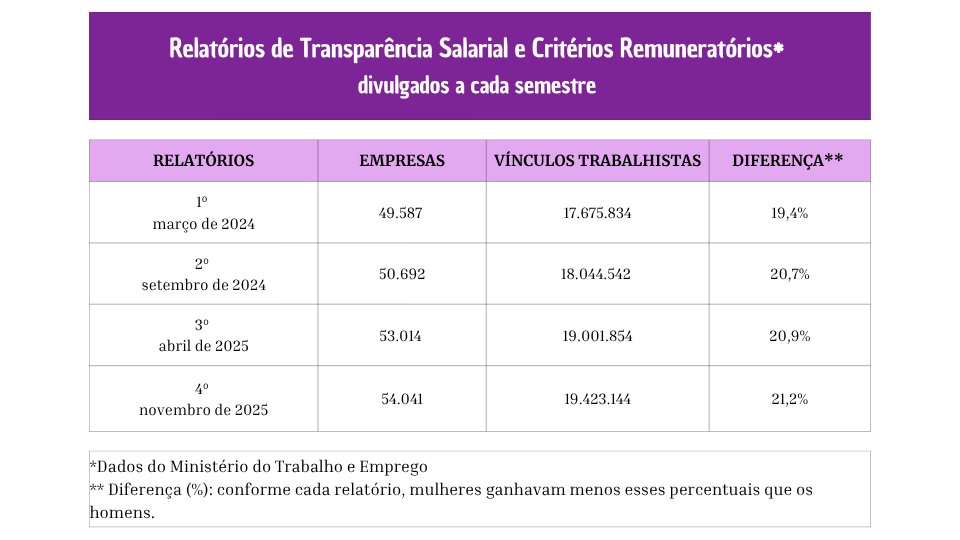 Desde a divulgação do 1º Relatório de Transparência Salarial, em março de 2024, até o mais recente, de novembro de 2025, é possível perceber um aumento da desigualdade de remuneração entre homens e mulheres de 1,8 ponto percentual (p.p), como mostra o quadro a seguir: